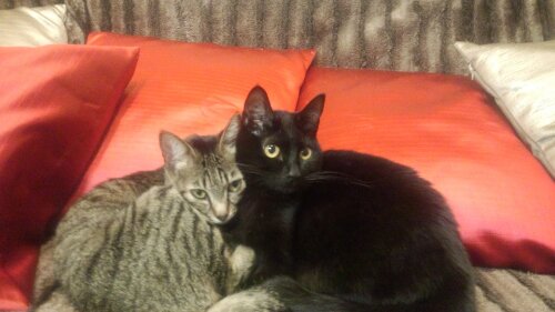 ときどき ケンカするふたりの猫 歌麿ちゃんと夢二ちゃん 今日は仲良く温め合ってます(^-^)