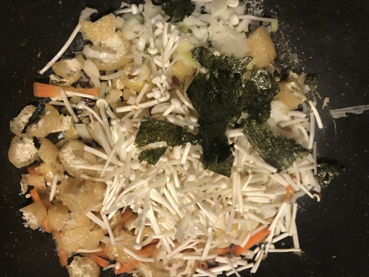 まさかの油揚げ入りネギ えのき 人参 油揚げ 海苔で作る。 皆んな 気がつかずに食べてた(笑笑)