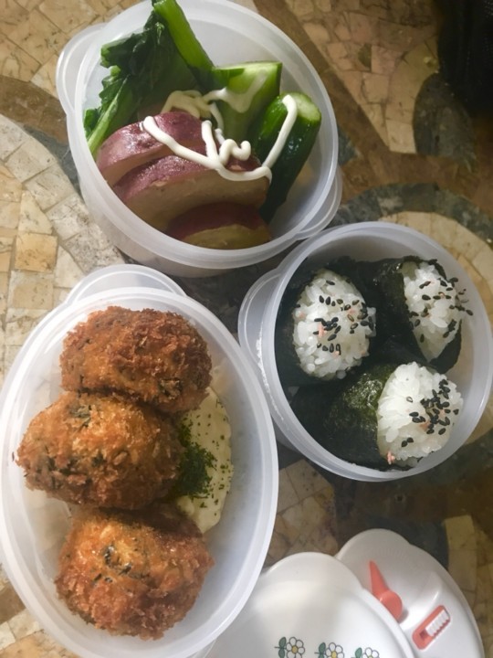 「昭和かっ!」と突っ込まれそうなサツマイモ煮たのと小松菜炒めたのと… 炊きたてのご飯を 塩むすびにした後