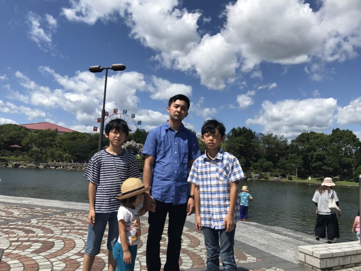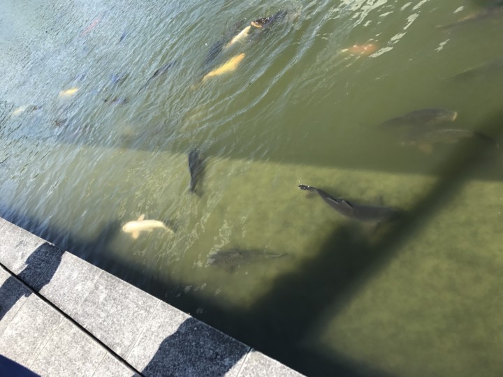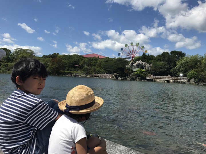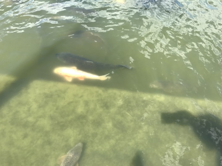 お父さんが駐車場へ車を停車するのを待ってる間に、しばらく鯉を眺めて待つ2人。