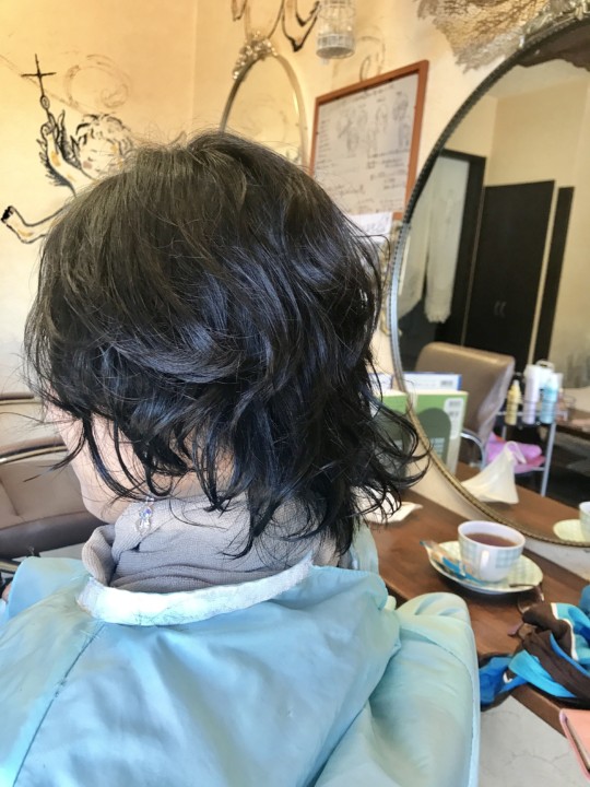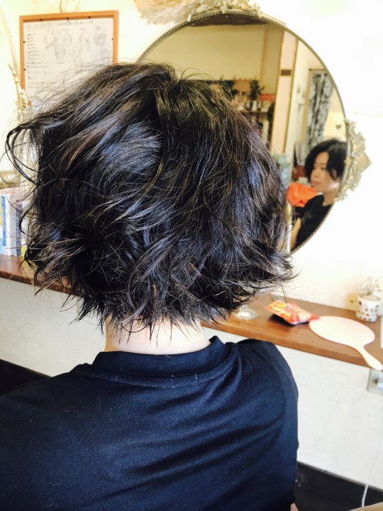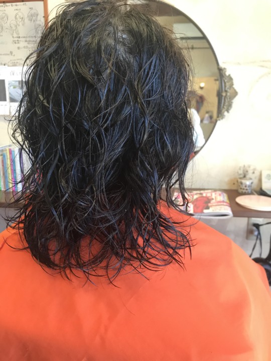 伸ばしかけの髪にパ一マをかける。