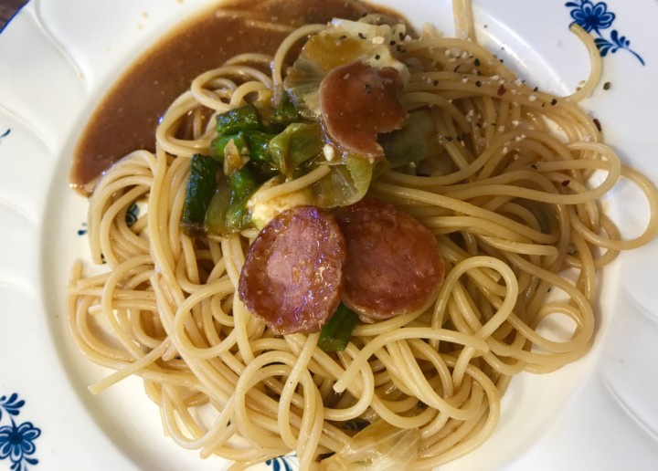 イタリアサラミとインゲン豆レタスのデミグラスソースパスタ🍝(カマンベールチ一ズ)