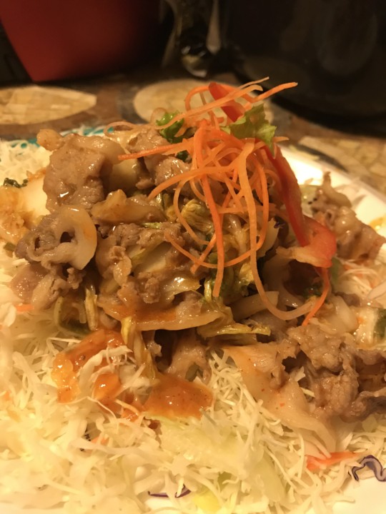 千切りキャベツの上に豚キムチを乗せて