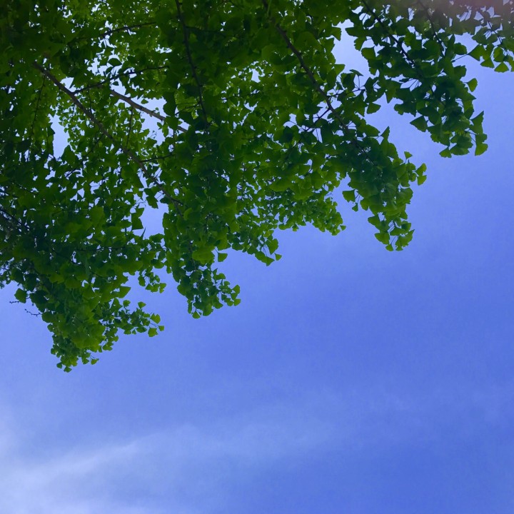 見上げた空の色と新緑の緑がとてもきれい!