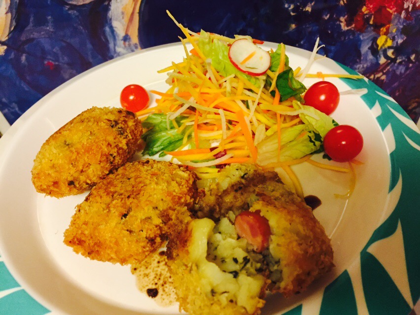 キノコとチ一ズと挽き肉入り春巻き(タマネギと白菜を細かく刻んで炒める)
