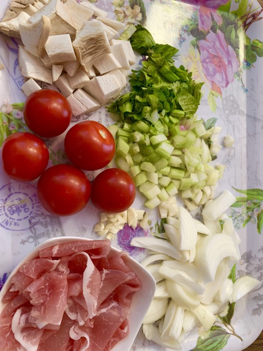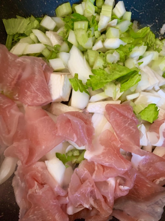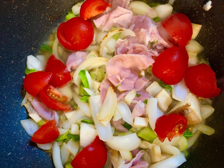 野菜と生ハムをお鍋に入れて炒めていきます。