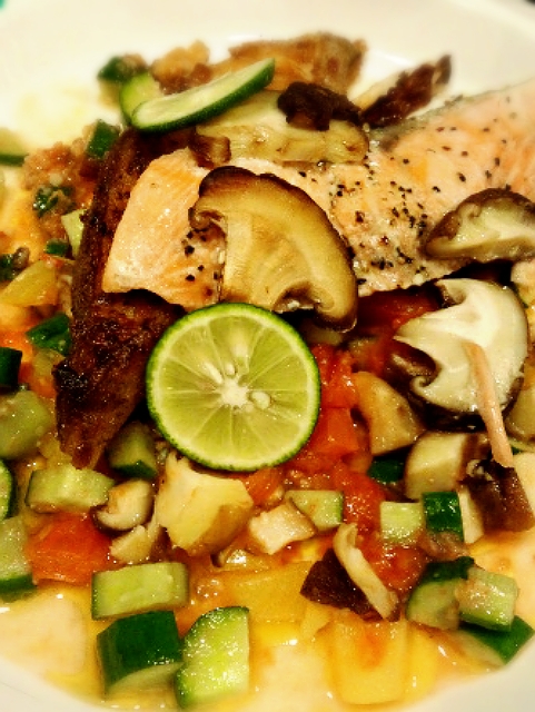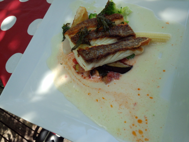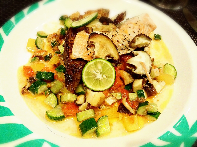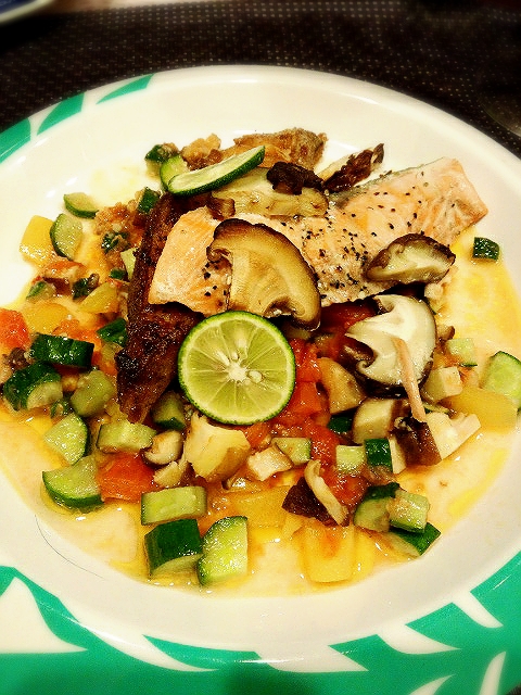 ※お皿に野菜のソースを盛り付けておいて*お魚を調理します。