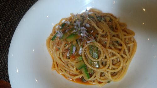 私は蟹とズッキーニのパスタ!