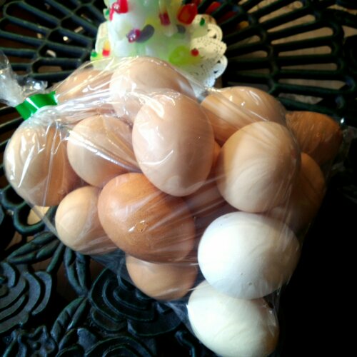 『うちの鶏たちはメロンを食べて育ってるから黄身の色が薄いよ。』