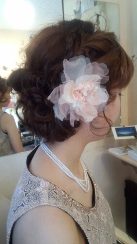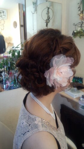 可愛い淡いピンクのお花を髪に付けて…