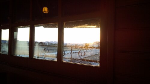テラスで夕暮れ時の
