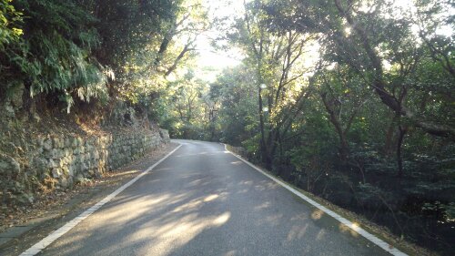 紅葉で彩づく細く曲がりくねった道を