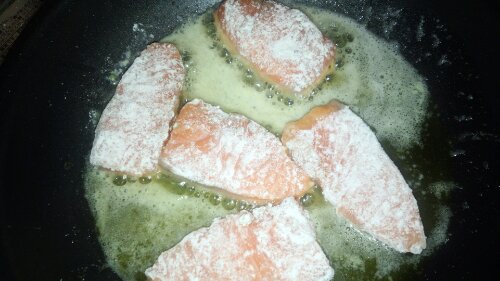 を温め、直前に下味を付けた鮭に小麦粉でまぶし、こんがり焼いていく。