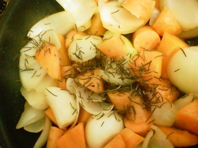 ②人参と玉ねぎをオリーブオイルで
