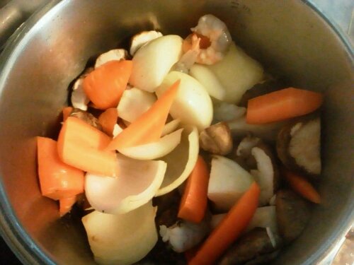 人参・椎茸・玉ねぎ・海老(殻つき) をオリーブオイルで炒めて 香りが広がったら水をいれます。