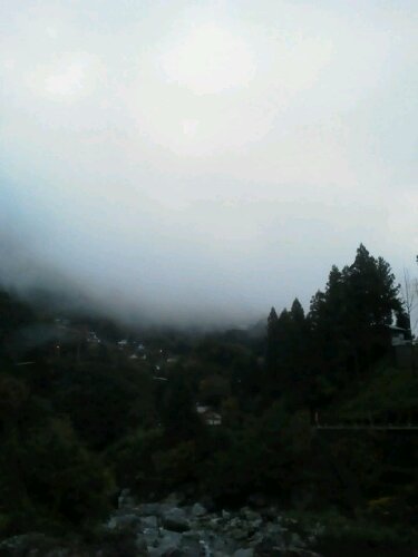 雨上がり霧包まれた山々を