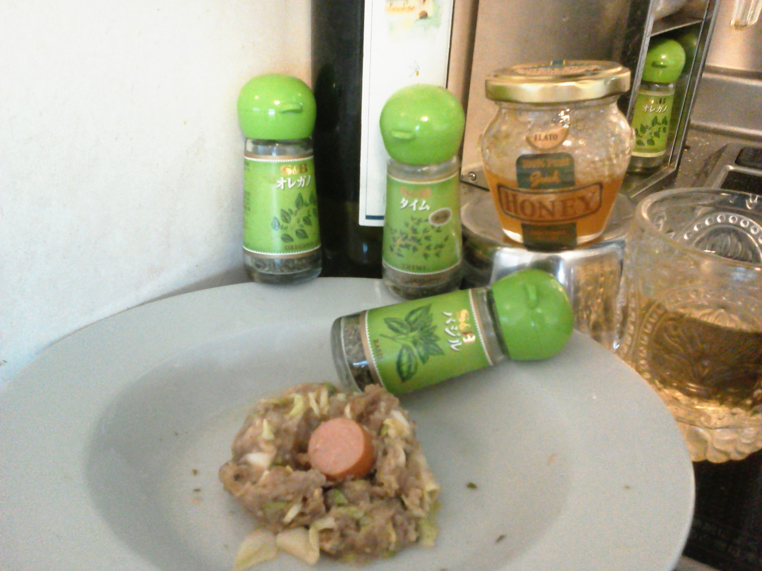 挽き肉にタイム・オレガノ・バジル・フランスの岩塩・黒コショウ・ギリシャの蜂蜜・びわ酒・キャベツ・ソーセージ(^-^)