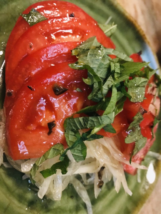 醤油とバジルのソ一スで仕上げて。